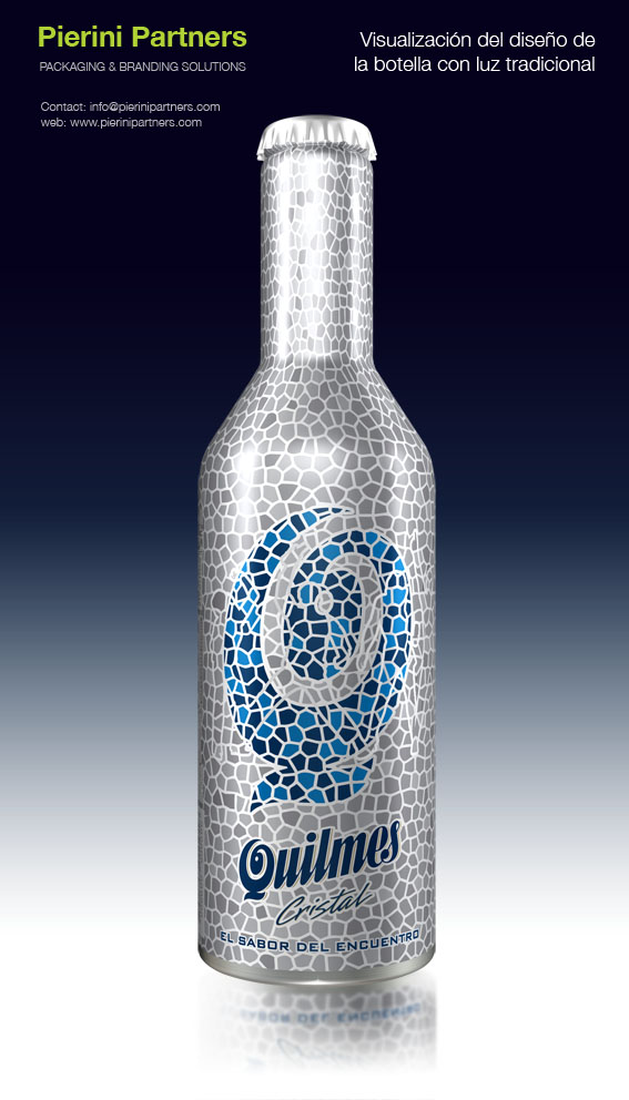 Su partido gráfico consistió en cubrir, mediante una delicada textura de pequeños mosaicos plateados, el cuerpo de la botella. De esta manera se logró, por un lado, obtener la calidez necesaria para contrarrestar la frialdad del material y, por el otro, potenciar su capacidad lumínica llevando el brillo del aluminio al extremo. Estos pequeños módulos alteran su paleta cromática en la zona central del pack originando, mediante combinatorias de celestes y azules, la reconocida letra “Q”, síntesis del logotipo de la popular cerveza argentina. Si bien la utilización de estos recursos visuales ha logrado por sí misma transformar un objeto estático y funcional en una hermosa pieza de deseo, la verdadera magnitud de la propuesta cobra vida en la oscuridad.