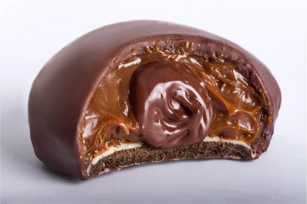 • Un núcleo doble: El corazón de la golosina es una combinación de mousse de chocolate aireada y una capa generosa de dulce de leche, creando un contraste de texturas cremosas.