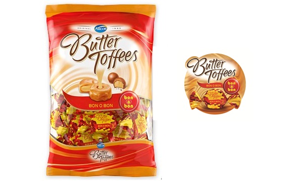 Los clásicos caramelos de leche se combinan con el cremoso y tradicional relleno bon o bon para ofrecer una propuesta atractiva e innovadora a los consumidores. El envoltorio mantiene el inconfundible diseño de Butter Toffees y suma los colores insignia de bon o bon: rojo y amarillo.