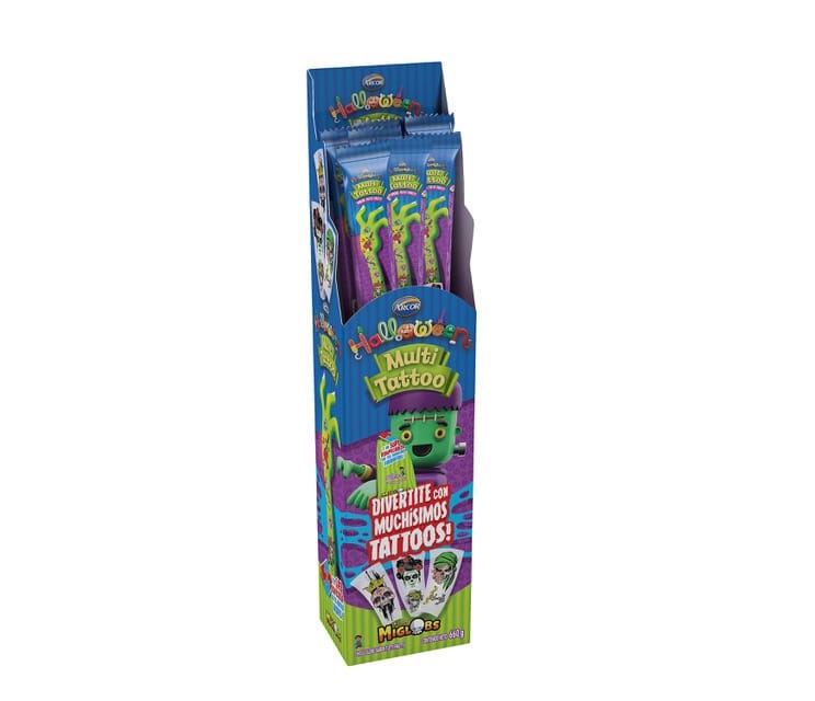 Así este año, como en los anteriores, podemos encontrarnos con gomitas en forma de calaveras y murciélagos, caramelos ácidos destinados al conjuro de hechizos, calabazas de Halloween rellenas de golosinas, chicles Calabacitas o con tatoos de terror, pastillas del terror, confites negros, y muchas otras más.
