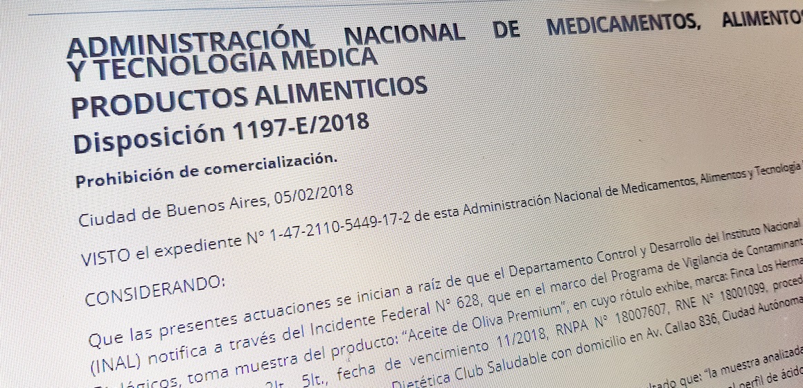 Según indica la Disposición 1197-E/2018 la prohibición surge luego de que los informes de laboratorio indicaran que “la muestra analizada no cumple con las especificaciones del artículo 535 del Código Alimentario Argentino (CAA), en lo que respecta al perfil de ácidos grasos para aceite de oliva, alimento adulterado”.
