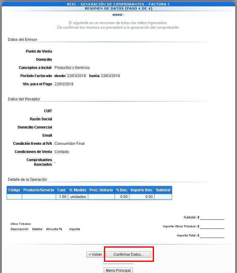 A continuación visualizarás el resumen de los datos. Si todo esta bien, seleccioná la opción «confirmar datos«.