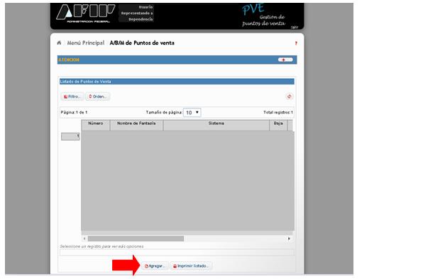 Seleccioná la opción “A/B/M de puntos de ventas”. Se desplegará el menú de “A/B/M de puntos de ventas”. Para habilitar un nuevo punto de venta seleccioná “Agregar”.