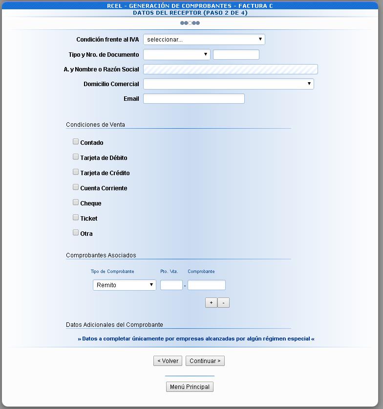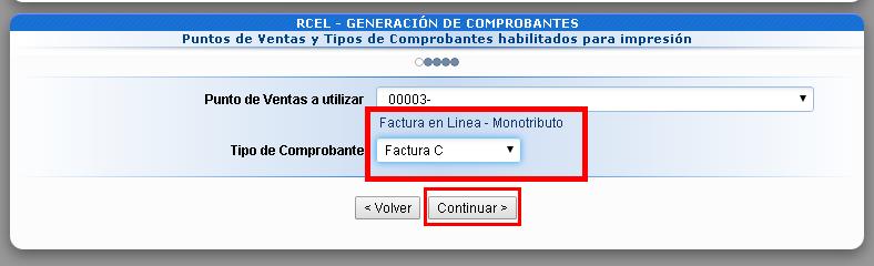Dentro de “Puntos de venta a utilizar” y “Tipo de Comprobante”, desplegá las opciones y seleccioná el correspondiente. Luego, presioná “Continuar”.