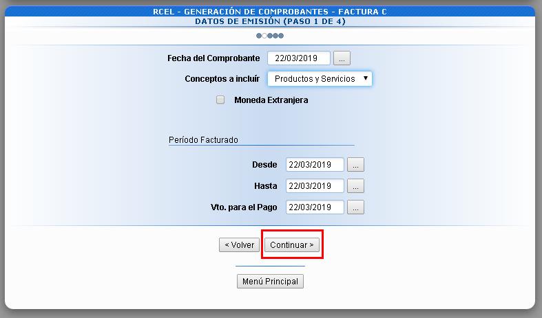 Dentro de DATOS DE EMISIÓN completá los datos correspondientes (Fecha, Conceptos a incluír, tildar si es venta en moneda extranjera y datos del período facturado), y presioná “Continuar”.