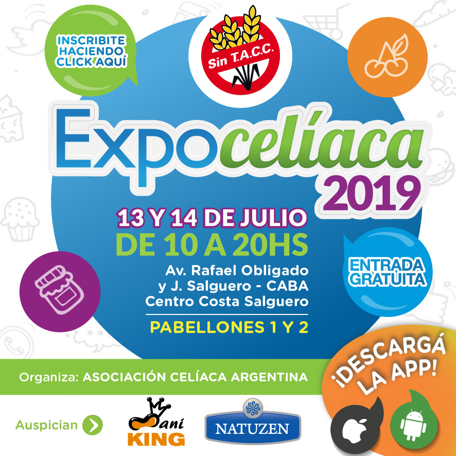 Expocelíaca 2019 se realizará los días 13 y 14 de Julio, de 10 a 20 horas en el Centro Costa Salguero, Av. Costanera R. Obligado y J. Salguero de la Ciudad de Buenos Aires, Pabellones 1 y 2 con acceso gratuito e ingreso con acreditación.