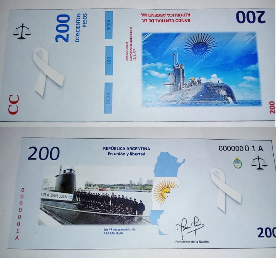 El billete con la imagen del submarino fue diseñado como parte de un trabajo práctico en la clase de Economía, por alumnas del cuarto Año de la Escuela secundaria José Manuel Estrada.