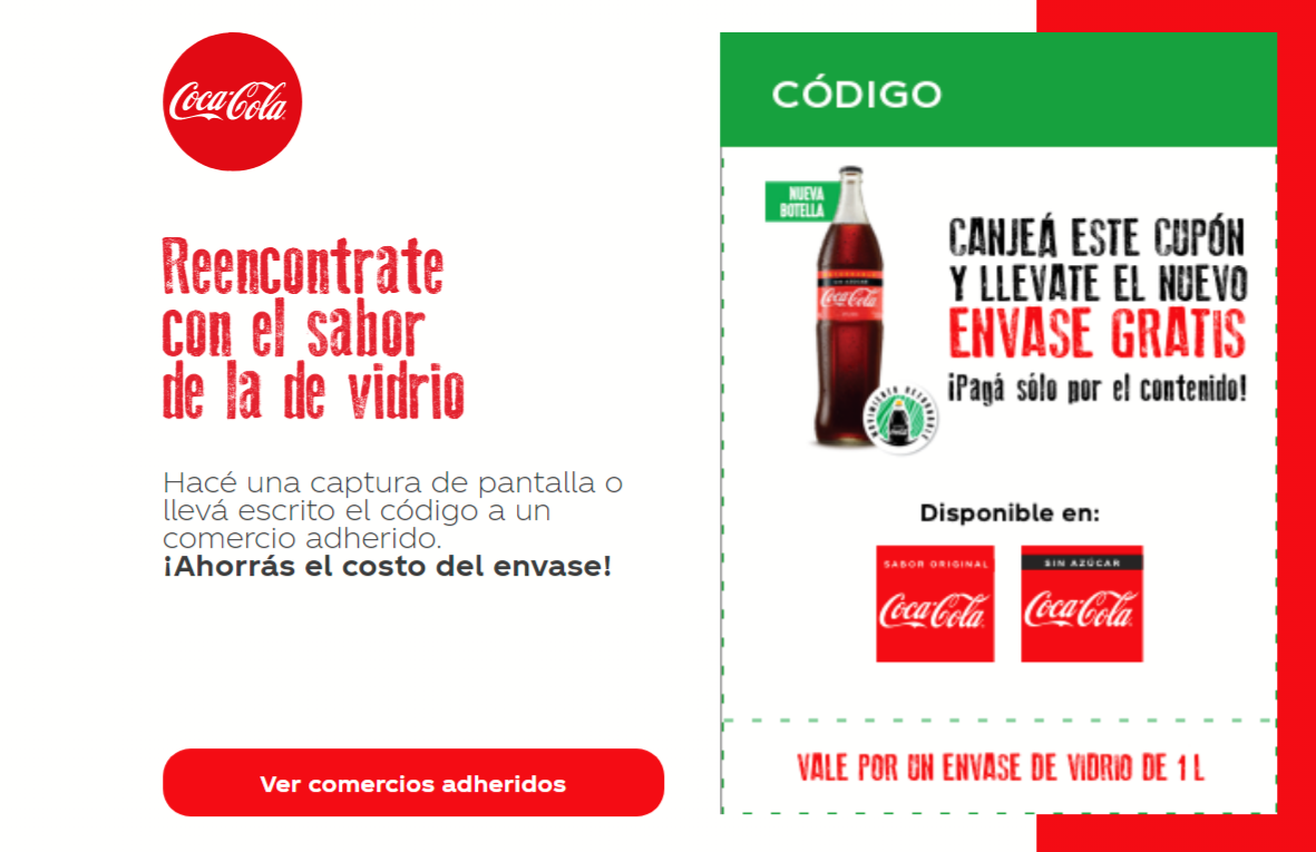 El cupón de la Acción Promocional será bajado en forma gratuita y sin obligación de compra previa de ningún producto de la línea coca cola.