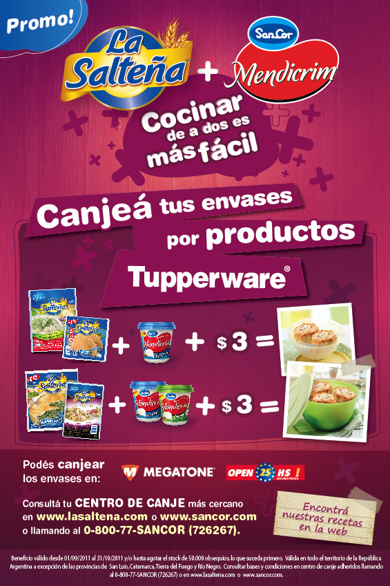 - 2 envases de La Salteña + 1 potes de Mendicrim + $ 3 para llevarse un Tupperware Maravilloso